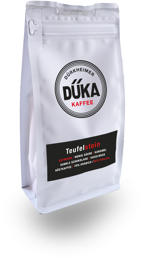 Ein charakterstarker Blend aus 70 % Arabica und 30 % Robusta, der durch seine dunklen Schokoladen- und Karamellnoten sofort begeistert. Die Arabicas bringen feine Süße und aromatische Nuancen von Haselnuss mit, während der Robusta für eine kräftige Struktur, eine dichte, samtige Crema und eine angenehm würzige Tiefe sorgt. Der Teufelstein ist vollmundig, intensiv und zugleich harmonisch – ein Espresso, der pur viel Druck und Ausdruck zeigt, in Milchgetränken aber ebenso hervorragend aufgeht und dort seine schokoladige Tiefe besonders schön entfaltet.